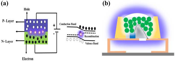 LEDは、図1aに示すように、p型半導体とn型半導体の両方を含む2つの半導体材料で構成された半導体デバイスです。順バイアス状態で電圧を印加すると、n側からの電子とp側からの正孔が空乏領域で再結合し、光子が放出されます。放出された光子の波長は実質的に蛍光体変換材料の使用によって決定されたもので、元素が半導体デバイスに含まれています。図1bに示されたように、pc − NIR LEDオプトエレクトロニクス部品の構造は、青色光を放出する際にエピタキシャル層シーケンス上に取り付けられたアルミニウムインジウムガリウムリンまたは窒化インジウムガリウムを基本とする青色半導体チップからなります。半導体チップは、ボンディングワイヤを介して凹部に埋め込まれたベースハウジング内のキャビティに接続されます。そして、秤量した量の無機燐光体変換材料をマトリックス材料(すなわちシリコーン)と混合し、ベースハウジングフレームのキャビティを満たします。反射体は、青色半導体チップからの一次放射およびマトリックス材料に埋め込まれた変換材料からの赤外ルミネセンスの最大反射を達成するために、凹部の内壁に被覆された適切な材料でベースハウジングユニットに取り付けられます。動作中、半導体デバイスから放出された青色光は、蛍光体変換材料の励起光源として機能し、その結果、赤外発光が生じます。近赤外LEDデバイスは、可視の赤と青の光の組み合わせが考えられるため、動作中は目に見えない赤外LEDに加えて青みがかった白色に見えます。 pc − NIR LED装置の製造は、白色LED装置の一般原則に従うもので、簡単に言えば、青色LEDチップから放出された光は、青色チップ上に堆積された近赤外蛍光体を励起するために使用され、それは近赤外ルミネセンスをもたらします。